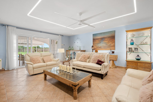 Desde esta zona, bordeada de olivos, se puede llegar a la entrada de la casa o salir directamente a la zona exterior, donde hay una gran terraza protegida, la piscina, una bonita zona con césped y palmeras grandes así como una bella fuente ornamental.