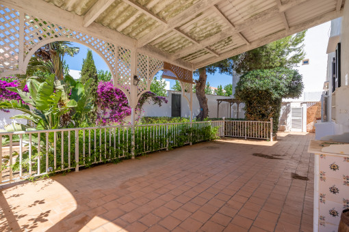 Espléndida casa señorial de 1907, pintada de un brillante amarillo dorado y rodeada de un frondoso jardín. Un remanso de tranquilidad y una burbuja de verdor a la entrada del pueblo de Sant Lluis, a menos de 5 min a pie del centro y de los comercios.